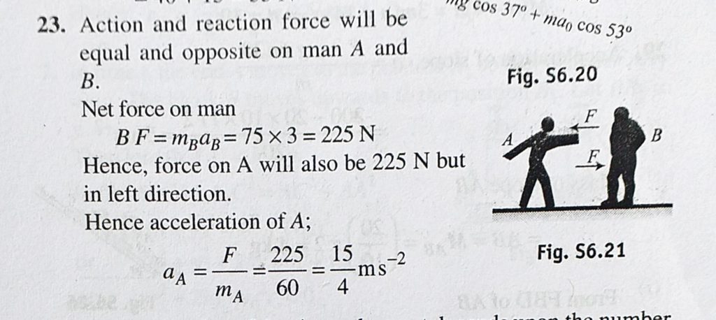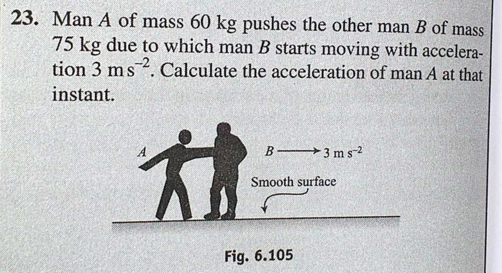 Man A of mass 60 kg pushes the other man B of mass 75 kg due to which man B starts moving with acceleration 3 m/s^2. Calculate the acceleration of man A at that instant. Man A of mass 60 kg pushes the other man B of mass 75 kg due to which man B starts moving with acceleration 3 m/s^2. Calculate the acceleration of man A at that instant. September 25, 2020 Category: Uncategorised (JEE Advanced Physics by BM Sharma + GMP Solutions) , Facebook Messenger WhatsApp Share this:TwitterFacebook Related