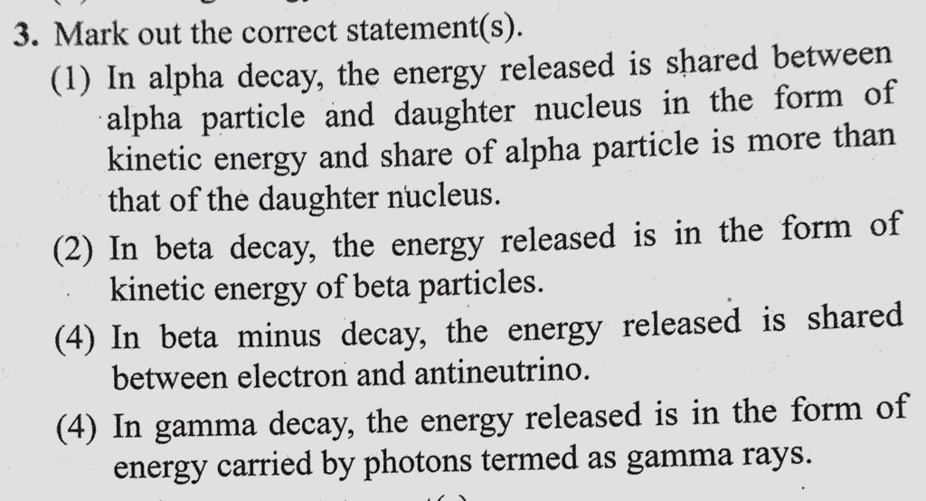 Mark out the correct statement(s). (1) In alpha decay, the energy released is shared between alpha particle and daughter nucleus in the form of kinetic energy and share of alpha particle is more than that of the daughter nucleus. Mark out the correct statement(s). (1) In alpha decay the energy released is shared between alpha particle and daughter nucleus in the form of kinetic energy and share of alpha particle is more than that of the daughter nucleus. October 18, 2020 Category: Uncategorised (JEE Advanced Physics by BM Sharma + GMP Solutions) , Facebook Messenger WhatsApp Share this:TwitterFacebook Related