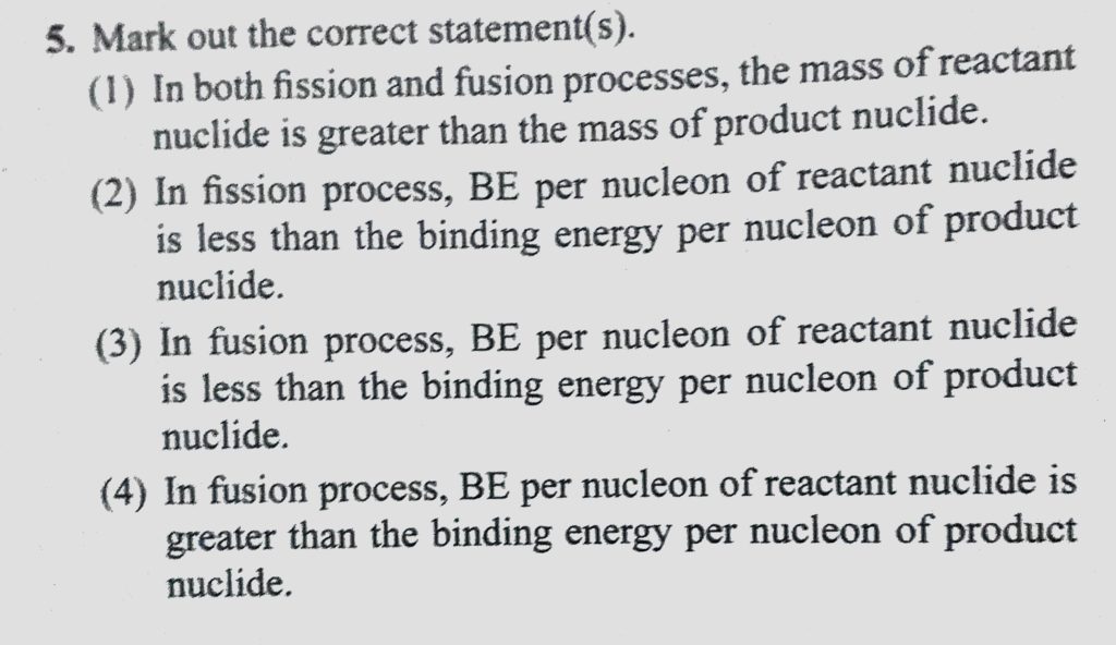 Mark out the correct statement(s) (1) In both fission and fusion processes, the mass of reactant nuclide is greater than the mass of product nuclide. (2) In fission process, BE per nucleon of reactant nuclide BE per nucleon of reactant nuclide Mark out the correct statement(s) (1) In both fission and fusion processes the mass of reactant nuclide is greater than the mass of product nuclide. (2) In fission process October 18, 2020 Category: Uncategorised (JEE Advanced Physics by BM Sharma + GMP Solutions) , Facebook Messenger WhatsApp Share this:TwitterFacebook Related