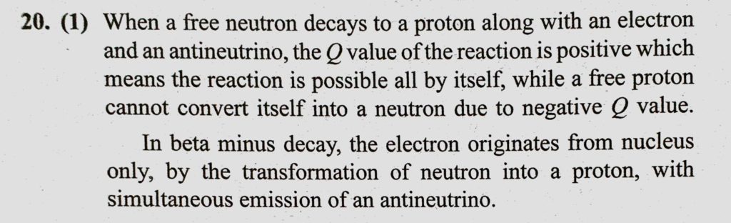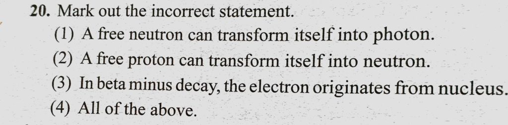 Mark out the incorrect statement. (1) A free neutron can transform itself into photon. (2) A free proton can transform itself into neutron. (3) In beta minus decay, the electron originates Mark out the incorrect statement. (1) A free neutron can transform itself into photon. (2) A free proton can transform itself into neutron. (3) In beta minus decay the electron originates October 17, 2020 Category: Uncategorised (JEE Advanced Physics by BM Sharma + GMP Solutions) , Facebook Messenger WhatsApp Share this:TwitterFacebook Related