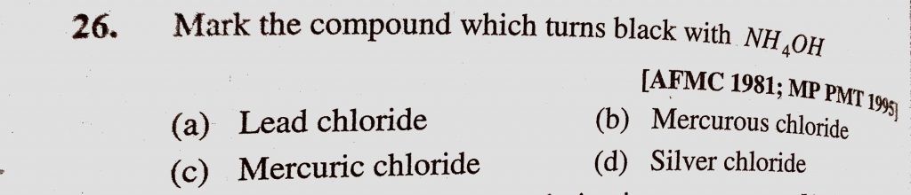 Mark the compound which turns black with NH4OH (a) Lead chloride (b) Mercurous chloride (c) Mercuric chloride Mark the compound which turns black with NH4OH (a) Lead chloride (b) Mercurous chloride (c) Mercuric chloride December 6, 2020 Category: Uncategorised (JEE Advanced Physics by BM Sharma + GMP Solutions) , Facebook Messenger WhatsApp Share this:TwitterFacebook Related
