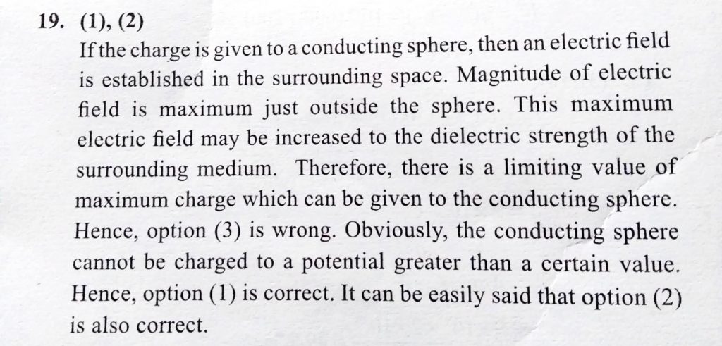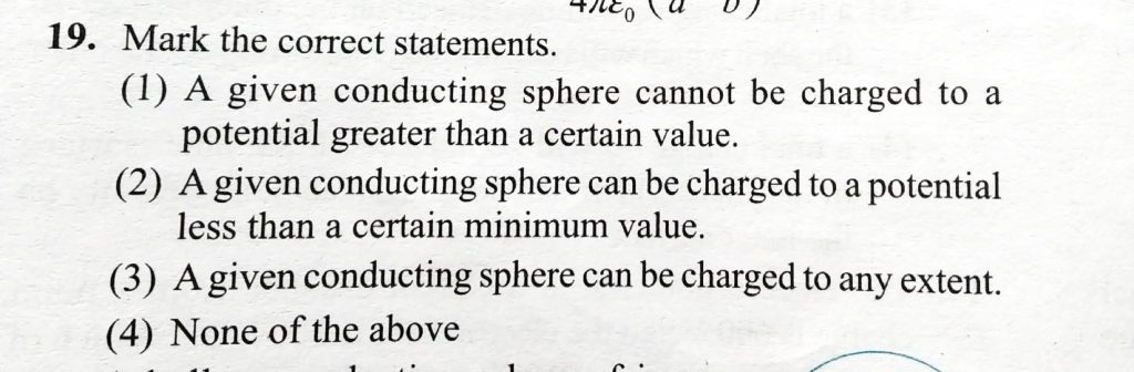 Mark the correct statements. (1) A given conducting sphere cannot be chraged to a potential greater than a certain value. Mark the correct statements. (1) A given conducting sphere cannot be chraged to a potential greater than a certain value. November 6, 2020 Category: Uncategorised (JEE Advanced Physics by BM Sharma + GMP Solutions) , Facebook Messenger WhatsApp Share this:TwitterFacebook Related