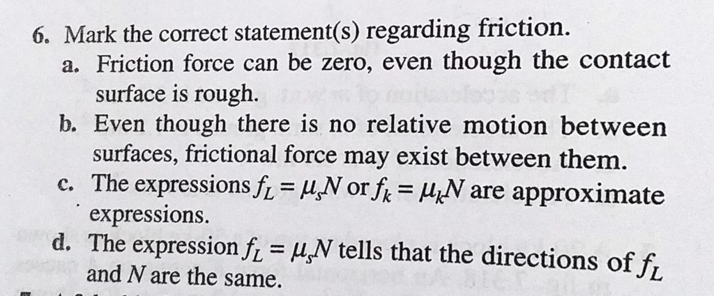 Mark the correct statements(s) regarding friction. a. Friction force can be zero, even though the contact surface is rough. b. Even though there is no relative motion between surfaces, even though the contact surface is rough. b. Even though there is no relative motion between surfaces Mark the correct statements(s) regarding friction. a. Friction force can be zero October 1, 2020 Category: Uncategorised (JEE Advanced Physics by BM Sharma + GMP Solutions) , Facebook Messenger WhatsApp Share this:TwitterFacebook Related