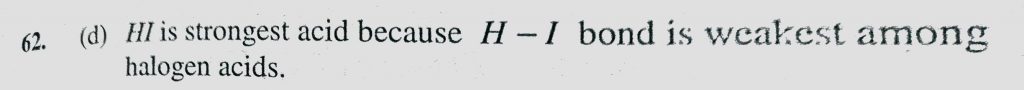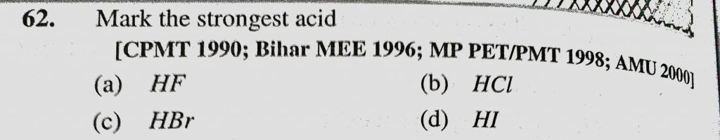 Mark the strongest acid (a) HF (b) HCl (c) HBr (d) HI Mark the strongest acid (a) HF (b) HCl (c) HBr (d) HI November 24, 2020 Category: Uncategorised (JEE Advanced Physics by BM Sharma + GMP Solutions) , Facebook Messenger WhatsApp Share this:TwitterFacebook Related