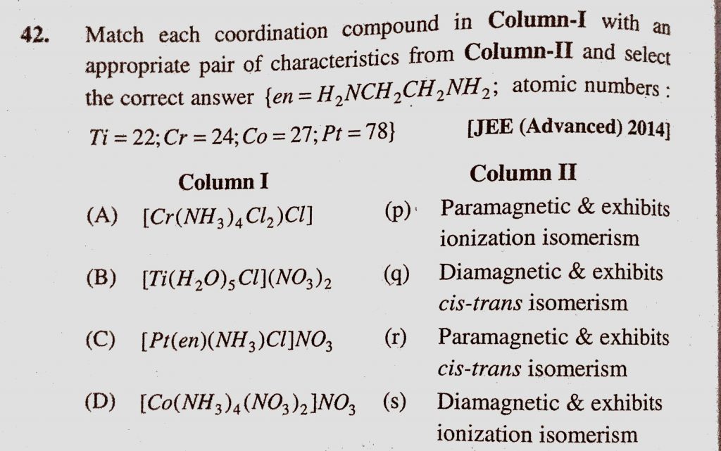 Match each coordination compound in Column – I with an appropriate pair of characteristics from Column – II and select the correct answer Match each coordination compound in Column - I with an appropriate pair of characteristics from Column - II and select the correct answer December 6, 2020 Category: Uncategorised (JEE Advanced Physics by BM Sharma + GMP Solutions) , Facebook Messenger WhatsApp Share this:TwitterFacebook Related