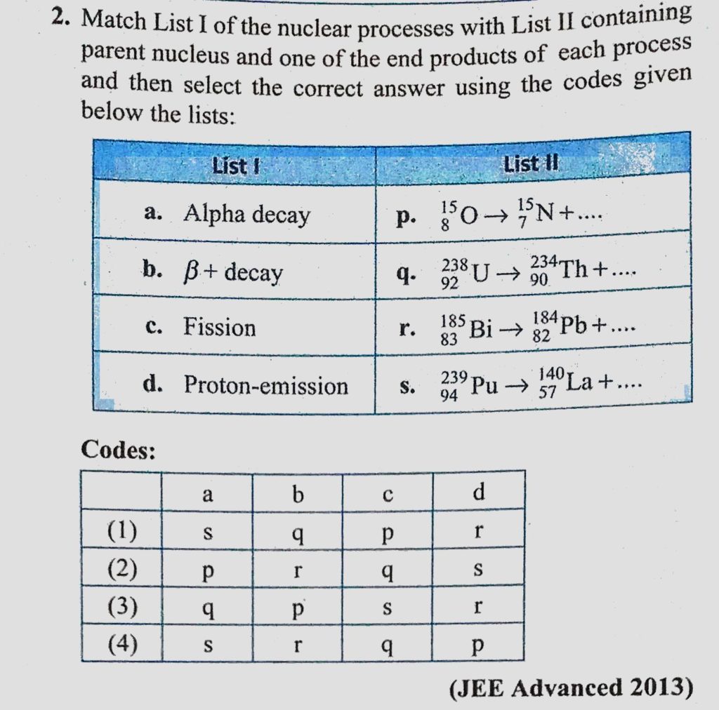 Match List 1 of the nuclear processes with List 2 containing parent nucleus and one of the end products of each process and then select the correct answer using the codes given below Match List 1 of the nuclear processes with List 2 containing parent nucleus and one of the end products of each process and then select the correct answer using the codes given below October 20, 2020 Category: Uncategorised (JEE Advanced Physics by BM Sharma + GMP Solutions) , Facebook Messenger WhatsApp Share this:TwitterFacebook Related
