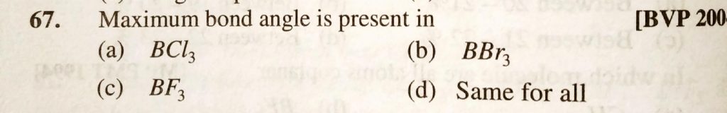 Maximum bond angle is present in (a) BCL3 (b) BBr3 (c) BF3 (d) same for all Maximum bond angle is present in (a) BCL3 (b) BBr3 (c) BF3 (d) same for all December 7, 2020 Category: Uncategorised (JEE Advanced Physics by BM Sharma + GMP Solutions) , Facebook Messenger WhatsApp Share this:TwitterFacebook Related