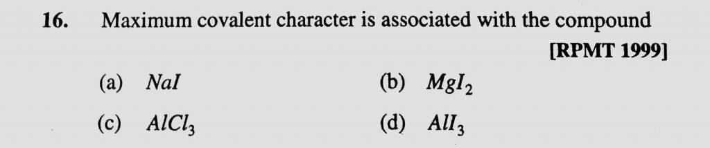 Maximum covalent character is associated with the compound (a) NaI (b) MgI2 (c) AlCl3 (d) ALI3 Maximum covalent character is associated with the compound (a) NaI (b) MgI2 (c) AlCl3 (d) ALI3 December 2, 2020 Category: Uncategorised (JEE Advanced Physics by BM Sharma + GMP Solutions) , Facebook Messenger WhatsApp Share this:TwitterFacebook Related
