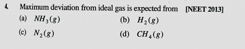 Maximum deviation from ideal gas is expected from (a) NH3 (g) (b) H2 (g) (c) N2 (g) (d) CH4 (g) Maximum deviation from ideal gas is expected from (a) NH3 (g) (b) H2 (g) (c) N2 (g) (d) CH4 (g) February 12, 2021 Category: Uncategorised (JEE Advanced Physics by BM Sharma + GMP Solutions) , Facebook Messenger WhatsApp Share this:TwitterFacebook Related