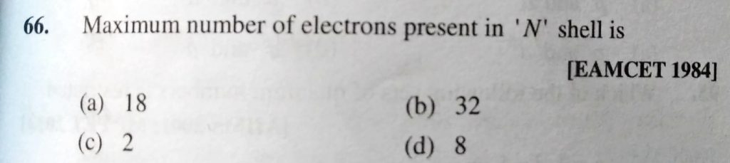 Maximum number of electrons present in ‘N’ shell is (a) 18 (b) 32 (c) 2 (d) 8 Maximum number of electrons present in 'N' shell is (a) 18 (b) 32 (c) 2 (d) 8 November 28, 2020 Category: Uncategorised (JEE Advanced Physics by BM Sharma + GMP Solutions) , Facebook Messenger WhatsApp Share this:TwitterFacebook Related