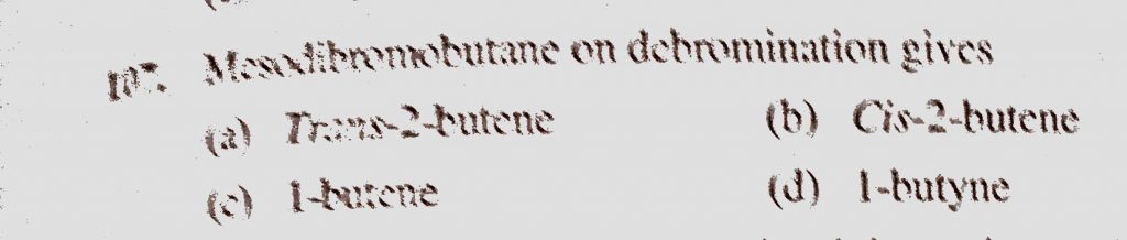 Mesodibromobutane on debromination gives (a) Trans -2- butene (b) Cis -2- butene (c) 1-butene (d) 1-butyne Mesodibromobutane on debromination gives (a) Trans -2- butene (b) Cis -2- butene (c) 1-butene (d) 1-butyne February 8, 2021 Category: Uncategorised (JEE Advanced Physics by BM Sharma + GMP Solutions) , Facebook Messenger WhatsApp Share this:TwitterFacebook Related