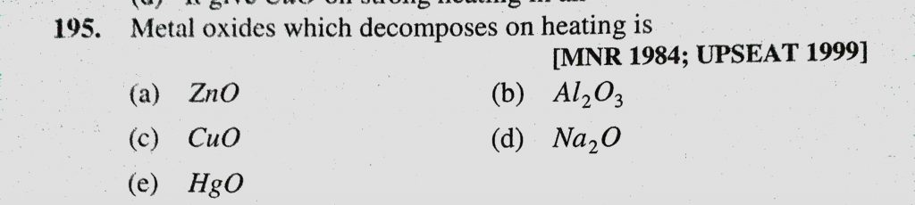 Metal oxides which decomposes on heating is (a) ZnO (b) Al2O3 (c) CuO (d) Na2O Metal oxides which decomposes on heating is (a) ZnO (b) Al2O3 (c) CuO (d) Na2O December 2, 2020 Category: Uncategorised (JEE Advanced Physics by BM Sharma + GMP Solutions) , Facebook Messenger WhatsApp Share this:TwitterFacebook Related
