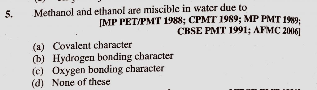 Methanol and ethanol are miscible in water due to (a) Covalent character (b) Hydrogen bonding character (c) Oxygen bonding character (d) None of these Methanol and ethanol are miscible in water due to (a) Covalent character (b) Hydrogen bonding character (c) Oxygen bonding character (d) None of these February 10, 2021 Category: Uncategorised (JEE Advanced Physics by BM Sharma + GMP Solutions) , Facebook Messenger WhatsApp Share this:TwitterFacebook Related
