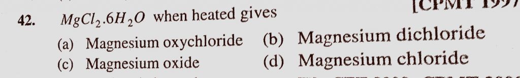 MgCl2.6H2O when heated gives (a) Magnesium oxychloride (b) Magnesium dichloride (c) Magnesium oxide (d) Magnesium chloride MgCl2.6H2O when heated gives (a) Magnesium oxychloride (b) Magnesium dichloride (c) Magnesium oxide (d) Magnesium chloride November 15, 2020 Category: Uncategorised (JEE Advanced Physics by BM Sharma + GMP Solutions) , Facebook Messenger WhatsApp Share this:TwitterFacebook Related