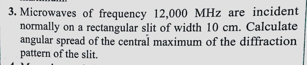 Microwaves of frequency 12000 MHz are incident normally on a rectangular slit of width 10 cm. Calculate angular spread of the central maximum of the diffraction pattern of the slit. Microwaves of frequency 12000 MHz are incident normally on a rectangular slit of width 10 cm. Calculate angular spread of the central maximum of the diffraction pattern of the slit. October 11, 2020 Category: Uncategorised (JEE Advanced Physics by BM Sharma + GMP Solutions) , Facebook Messenger WhatsApp Share this:TwitterFacebook Related