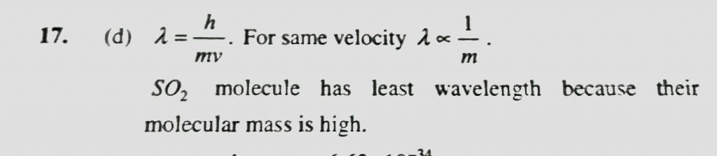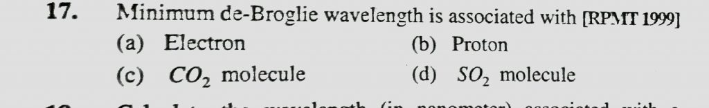 Minimum de – Broglie wavelength is associated with (a) Electron (b) Proton (c) CO2 (d) SO2 molecule Minimum de - Broglie wavelength is associated with (a) Electron (b) Proton (c) CO2 (d) SO2 molecule November 27, 2020 Category: Uncategorised (JEE Advanced Physics by BM Sharma + GMP Solutions) , Facebook Messenger WhatsApp Share this:TwitterFacebook Related