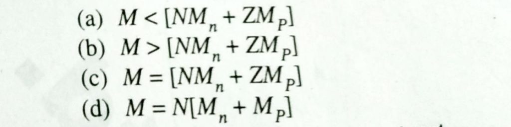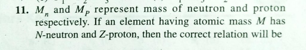 Mn and Mp reoresents mass of neutron and proton respectively. If an element having atomic mass M has N -neutron and Z – proton, then the correct relation will be Mn and Mp reoresents mass of neutron and proton respectively. If an element having atomic mass M has N -neutron and Z - proton then the correct relation will be September 14, 2020 Category: Uncategorised (JEE Advanced Physics by BM Sharma + GMP Solutions) , Facebook Messenger WhatsApp Share this:TwitterFacebook Related