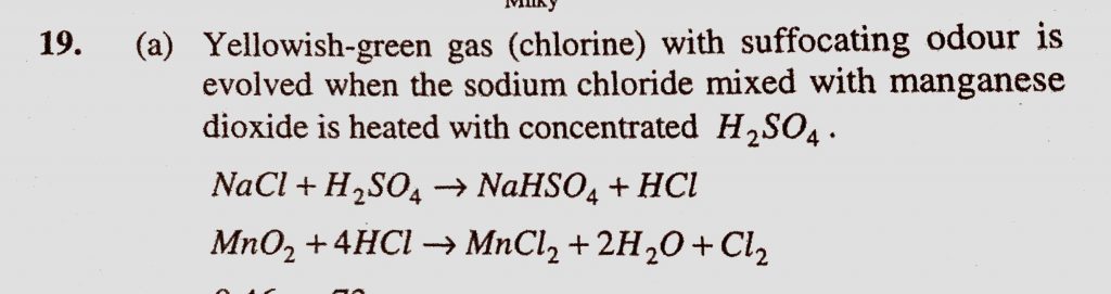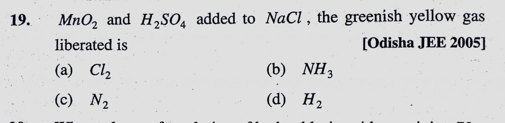MnO2 and H2SO4 added to NaCl, the greenish yellow gas liberated is (a) Cl2 (b) NH3 (c) N2 (d) H2 MnO2 and H2SO4 added to NaCl the greenish yellow gas liberated is (a) Cl2 (b) NH3 (c) N2 (d) H2 December 6, 2020 Category: Uncategorised (JEE Advanced Physics by BM Sharma + GMP Solutions) , Facebook Messenger WhatsApp Share this:TwitterFacebook Related