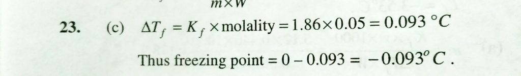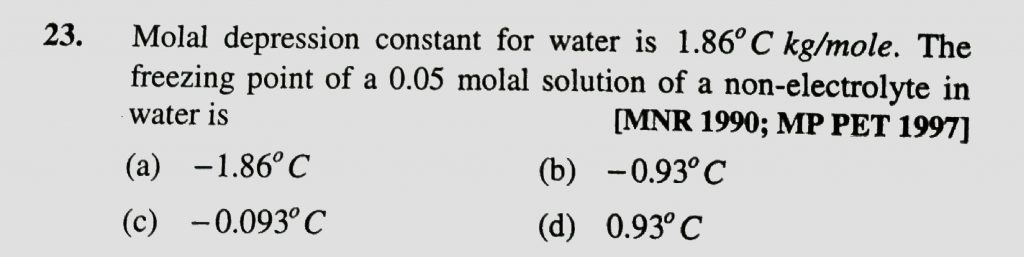Molal depression constant for water is 1.86 degree C kg / mole. The freeezing point of a 0.05 molal solution of non- electrolyte in water is Molal depression constant for water is 1.86 degree C kg / mole. The freeezing point of a 0.05 molal solution of non- electrolyte in water is December 14, 2020 Category: Uncategorised (JEE Advanced Physics by BM Sharma + GMP Solutions) , Facebook Messenger WhatsApp Share this:TwitterFacebook Related