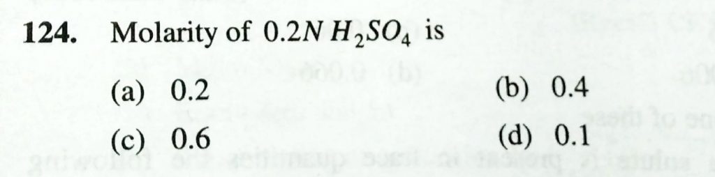 Molarity of 0.2 N H2SO4 is (a) 0.2 (b) 0.4 (c) 0.6 (d) 0.1 Molarity of 0.2 N H2SO4 is (a) 0.2 (b) 0.4 (c) 0.6 (d) 0.1 December 12, 2020 Category: Uncategorised (JEE Advanced Physics by BM Sharma + GMP Solutions) , Facebook Messenger WhatsApp Share this:TwitterFacebook Related