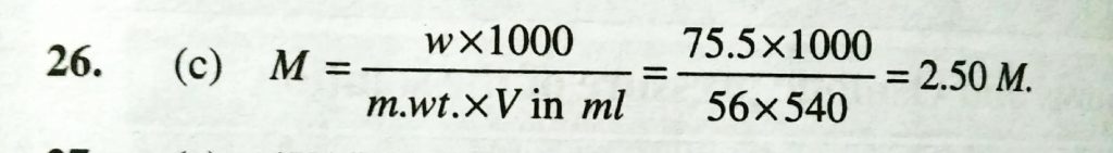 Molarity of a solution prepared by dissolving 75.5 g of pure KOH in 540 ml solution is Molarity of a solution prepared by dissolving 75.5 g of pure KOH in 540 ml solution is December 11, 2020 Category: Uncategorised (JEE Advanced Physics by BM Sharma + GMP Solutions) , Facebook Messenger WhatsApp Share this:TwitterFacebook Related