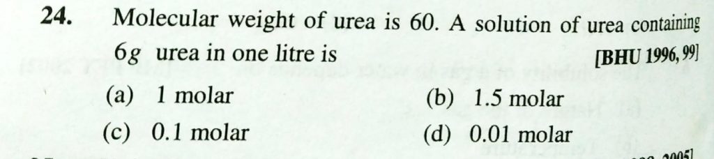 Molecular weight of urea is 60. A solution of urea containing 6 g urea in one litre is Molecular weight of urea is 60. A solution of urea containing 6 g urea in one litre is December 11, 2020 Category: Uncategorised (JEE Advanced Physics by BM Sharma + GMP Solutions) , Facebook Messenger WhatsApp Share this:TwitterFacebook Related