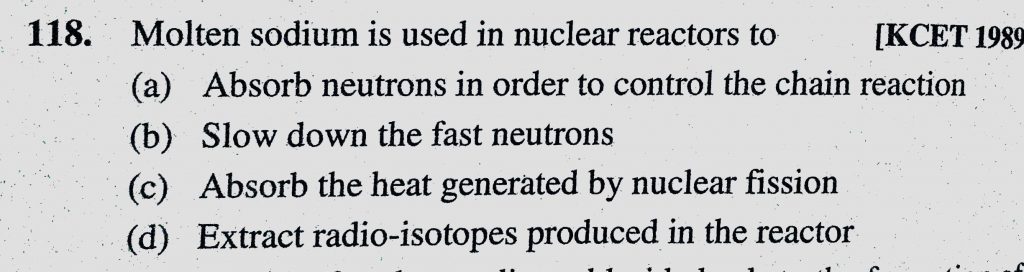 Molten sodium is used in nuclear reactors to (a) Absorb neutrons in order to control the chain reaction (b) Slow down the fast neutrons Molten sodium is used in nuclear reactors to (a) Absorb neutrons in order to control the chain reaction (b) Slow down the fast neutrons November 15, 2020 Category: Uncategorised (JEE Advanced Physics by BM Sharma + GMP Solutions) , Facebook Messenger WhatsApp Share this:TwitterFacebook Related