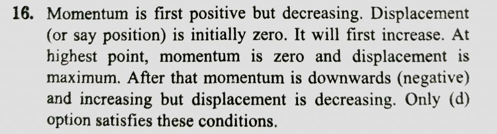 Momentum is first positive but decreasing. Displacement ( or say position ) is initially zero. It will first increase. At highest point, momentum is zero and displacement is maximum. After that momentum is downwards (negative) and increasing but displacement is decreasing. Only (d) option satisfies these conditions.
