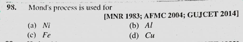 Mond’s process is used for (a) Ni (b) Al (c) Fe (d) Cu Mond's process is used for (a) Ni (b) Al (c) Fe (d) Cu December 1, 2020 Category: Uncategorised (JEE Advanced Physics by BM Sharma + GMP Solutions) , Facebook Messenger WhatsApp Share this:TwitterFacebook Related