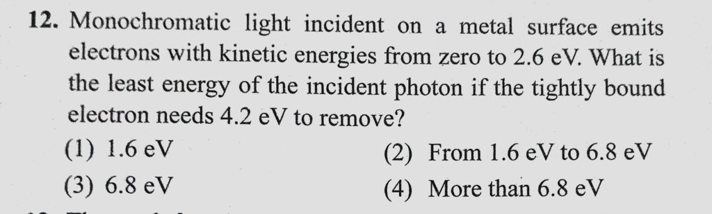 Monochromatic light incident on a metal surface emits electrons with kinetic energies from zero to 2.6 eV. What is the least energy of the incident photon if the tightly bound electron Monochromatic light incident on a metal surface emits electrons with kinetic energies from zero to 2.6 eV. What is the least energy of the incident photon if the tightly bound electron October 12, 2020 Category: Uncategorised (JEE Advanced Physics by BM Sharma + GMP Solutions) , Facebook Messenger WhatsApp Share this:TwitterFacebook Related