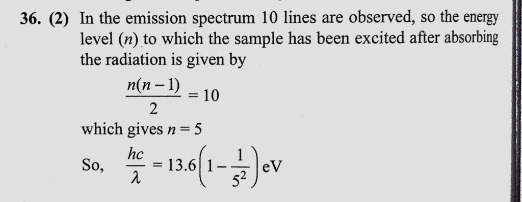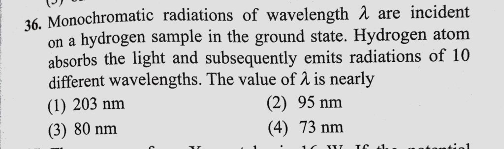 Monochromatic radiations of wavelength lemda are incident on a hydrogen sample in the ground state. Hydrogen atom absorbs the light and subsequently emits radiations of 10 different Monochromatic radiations of wavelength lemda are incident on a hydrogen sample in the ground state. Hydrogen atom absorbs the light and subsequently emits radiations of 10 different October 15, 2020 Category: Uncategorised (JEE Advanced Physics by BM Sharma + GMP Solutions) , Facebook Messenger WhatsApp Share this:TwitterFacebook Related