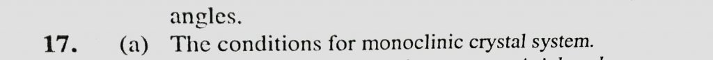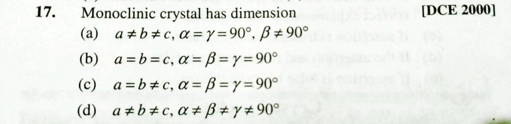 Monoclinic crystal has dimension (a) a ≠ b ≠ c,α = γ = 90∘,β ≠ 90∘ (b) a ≠b ≠ c,α = β = γ = 90∘ (c) a ≠ b≠ c, α = β = 90∘,γ = 120∘ (d) a ≠ b ≠ c,α = β = ,γ = 120∘ Monoclinic crystal has dimension (a) a ≠ b ≠ c α = β = α = β = 90∘ α = β = γ = 90∘ (c) a ≠ b≠ c α = γ = 90∘ β ≠ 90∘ (b) a ≠b ≠ c γ = 120∘ γ = 120∘ (d) a ≠ b ≠ c December 16, 2020 Category: Uncategorised (JEE Advanced Physics by BM Sharma + GMP Solutions) , Facebook Messenger WhatsApp Share this:TwitterFacebook Related