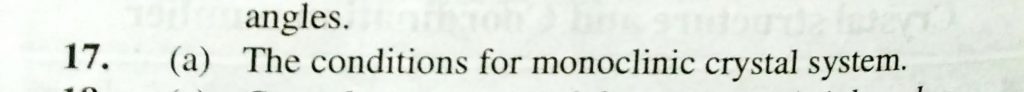 Monoclinic crystal has dimension (a) a is not equal to b is not equal to c ,alpha = gama = 90 degree , bita is not equal to 90 degree (b) a = b = c , alpha = bita = gama = 90 degree (c) a = b is not equal to c , alpha = bita = gama = 90 degree (d) a is not equal to b is not equal to c , alpha i snot equal to bita is not equal to gama is not equal to 90 degree