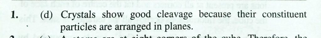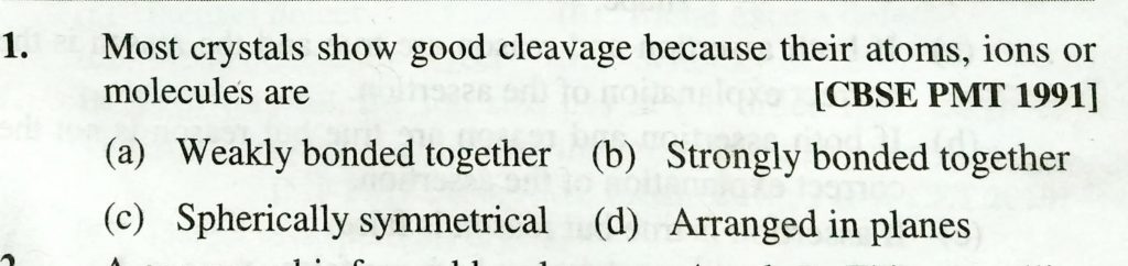 Most crystals show good cleavage because their atoms, ions or molecules are (a) weakely bonded together (b) strongly bonded together (c) spherically symmetrical (d) arranged in planes ions or molecules are (a) weakely bonded together (b) strongly bonded together (c) spherically symmetrical (d) arranged in planes Most crystals show good cleavage because their atoms February 9, 2021 Category: Uncategorised (JEE Advanced Physics by BM Sharma + GMP Solutions) , Facebook Messenger WhatsApp Share this:TwitterFacebook Related