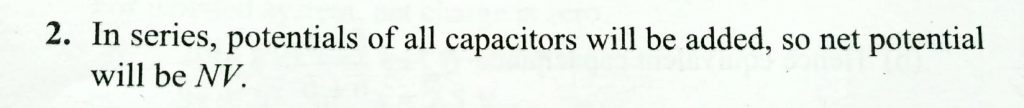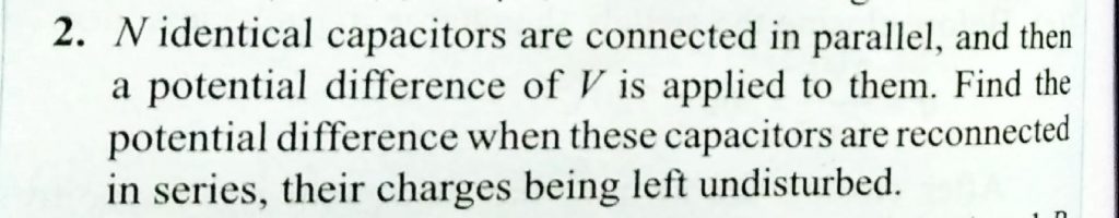 N identical capactiors are connected in parallel , and then a potrential difference of V is applied to them. Find the potential difference when these capacitors are reconnected in series, their charges being left undistrubed. and then a potrential difference of V is applied to them. Find the potential difference when these capacitors are reconnected in series N identical capactiors are connected in parallel their charges being left undistrubed. November 7, 2020 Category: Uncategorised (JEE Advanced Physics by BM Sharma + GMP Solutions) , Facebook Messenger WhatsApp Share this:TwitterFacebook Related