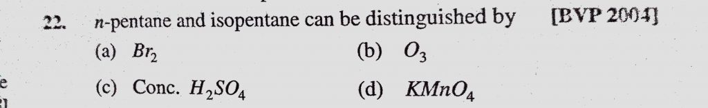 n-pentane and isopentane can be distinguished by (a) Br2 (b) O3 (c) Conc. H2SO4 (d) KMnO4 n-pentane and isopentane can be distinguished by (a) Br2 (b) O3 (c) Conc. H2SO4 (d) KMnO4 December 15, 2020 Category: Uncategorised (JEE Advanced Physics by BM Sharma + GMP Solutions) , Facebook Messenger WhatsApp Share this:TwitterFacebook Related
