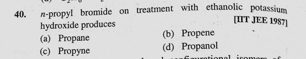 n-propyl bromide on treatment with ethanolic potassium hydroxide produces (a) Propane (b) Propene (c) Propyne (d) Propanol n-propyl bromide on treatment with ethanolic potassium hydroxide produces (a) Propane (b) Propene (c) Propyne (d) Propanol December 16, 2020 Category: Uncategorised (JEE Advanced Physics by BM Sharma + GMP Solutions) , Facebook Messenger WhatsApp Share this:TwitterFacebook Related