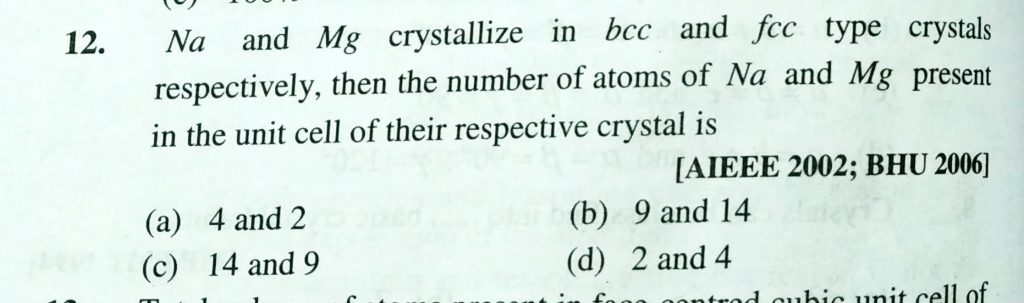 Na and Mg crystallize in bcc and fcc type crystals respectively , then the number of atoms of Na and Mg present in the unit cell of their respectively crystal is Na and Mg crystallize in bcc and fcc type crystals respectively then the number of atoms of Na and Mg present in the unit cell of their respectively crystal is February 8, 2021 Category: Uncategorised (JEE Advanced Physics by BM Sharma + GMP Solutions) , Facebook Messenger WhatsApp Share this:TwitterFacebook Related