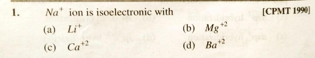 Na^+ ion is isoelectronic with (a) Li^+ (b) Mg^+2 (c) Ca^+2 (d) Ba^+2 Na^+ ion is isoelectronic with (a) Li^+ (b) Mg^+2 (c) Ca^+2 (d) Ba^+2 December 7, 2020 Category: Uncategorised (JEE Advanced Physics by BM Sharma + GMP Solutions) , Facebook Messenger WhatsApp Share this:TwitterFacebook Related