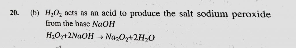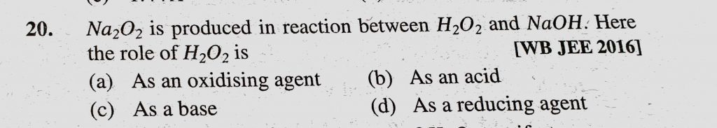 Na2O2 is produced in reaction between H2O2 and NaOH. Here the role of H2O2 is (a) As an oxidising agent (b) As an acid (c) As a base (d) As a reducing agent Na2O2 is produced in reaction between H2O2 and NaOH. Here the role of H2O2 is (a) As an oxidising agent (b) As an acid (c) As a base (d) As a reducing agent November 13, 2020 Category: Uncategorised (JEE Advanced Physics by BM Sharma + GMP Solutions) , Facebook Messenger WhatsApp Share this:TwitterFacebook Related