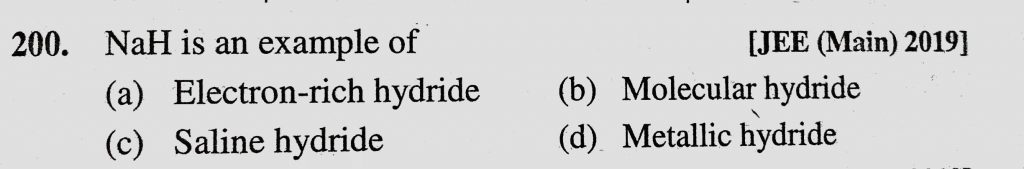 NaH is an example of (a) Electron-rich hydride (b) Molecular hydride (c) Saline hydride NaH is an example of (a) Electron-rich hydride (b) Molecular hydride (c) Saline hydride November 28, 2020 Category: Uncategorised (JEE Advanced Physics by BM Sharma + GMP Solutions) , Facebook Messenger WhatsApp Share this:TwitterFacebook Related
