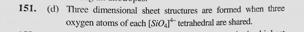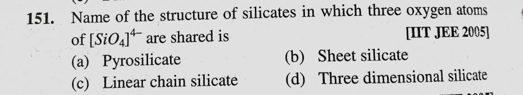 Name of the structure of silicates in which three oxygen atoms of (SiO4)4- are shared is (a) Pyrosilicate (b) Sheet silicate (c) Linear chain silicate Name of the structure of silicates in which three oxygen atoms of (SiO4)4- are shared is (a) Pyrosilicate (b) Sheet silicate (c) Linear chain silicate November 28, 2020 Category: Uncategorised (JEE Advanced Physics by BM Sharma + GMP Solutions) , Facebook Messenger WhatsApp Share this:TwitterFacebook Related
