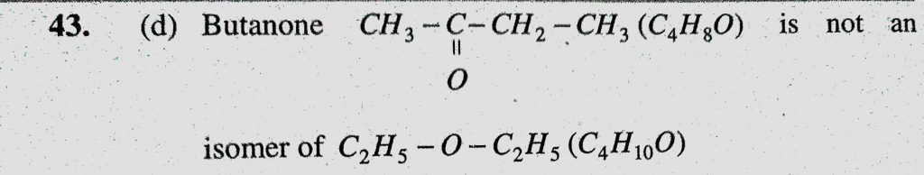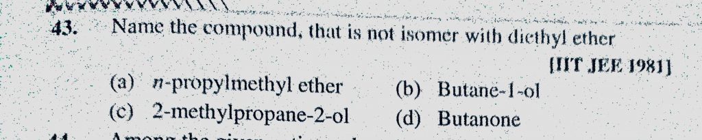 Name the compound that is not isomer with diethyl ether (a) n-propylmethyl ether (b) Butane-1-ol (c) 2-methylpropane -2-ol Name the compound that is not isomer with diethyl ether (a) n-propylmethyl ether (b) Butane-1-ol (c) 2-methylpropane -2-ol December 11, 2020 Category: Uncategorised (JEE Advanced Physics by BM Sharma + GMP Solutions) , Facebook Messenger WhatsApp Share this:TwitterFacebook Related