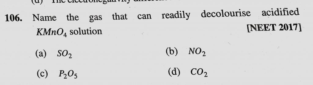 Name the gas that can readily decolourise acidified KMnO4 solution (a) SO2 (b) NO2 (c) P2O5 (d) CO2 Name the gas that can readily decolourise acidified KMnO4 solution (a) SO2 (b) NO2 (c) P2O5 (d) CO2 November 24, 2020 Category: Uncategorised (JEE Advanced Physics by BM Sharma + GMP Solutions) , Facebook Messenger WhatsApp Share this:TwitterFacebook Related