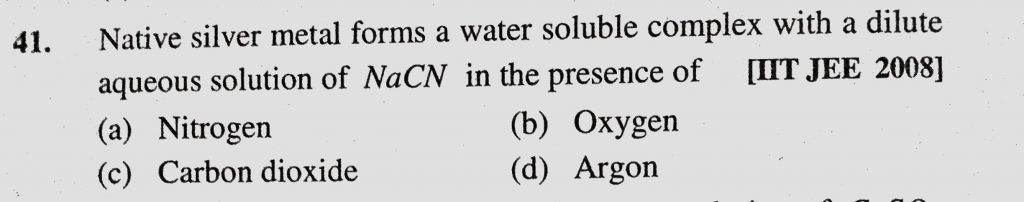 Native silver metal forms a water soluble complex with a dilute aqueous solution of NaCN in the presence of (a) Nitrogen (b) Oxygen (c) Carbon dioxide Native silver metal forms a water soluble complex with a dilute aqueous solution of NaCN in the presence of (a) Nitrogen (b) Oxygen (c) Carbon dioxide December 2, 2020 Category: Uncategorised (JEE Advanced Physics by BM Sharma + GMP Solutions) , Facebook Messenger WhatsApp Share this:TwitterFacebook Related