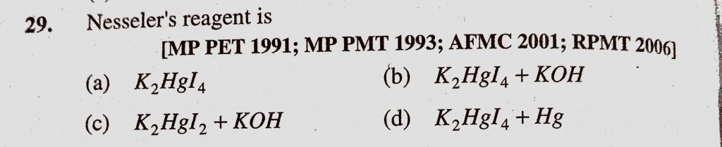 Nesseler’s reagent is (a) K2HgI4 (b) K2HgI4 + KOH (C) k2HgI2 + KOH Nesseler's reagent is (a) K2HgI4 (b) K2HgI4 + KOH (C) k2HgI2 + KOH December 6, 2020 Category: Uncategorised (JEE Advanced Physics by BM Sharma + GMP Solutions) , Facebook Messenger WhatsApp Share this:TwitterFacebook Related