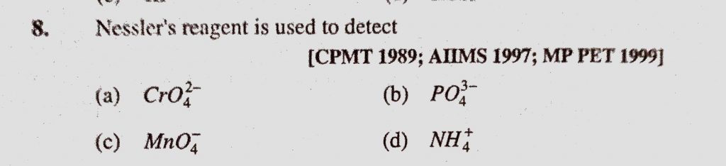 Nessler’s reagent is used to detect (a) CrO4 2- (b) PO4 3- (c) MnO4 – (d) NH4 + Nessler's reagent is used to detect (a) CrO4 2- (b) PO4 3- (c) MnO4 - (d) NH4 + December 6, 2020 Category: Uncategorised (JEE Advanced Physics by BM Sharma + GMP Solutions) , Facebook Messenger WhatsApp Share this:TwitterFacebook Related