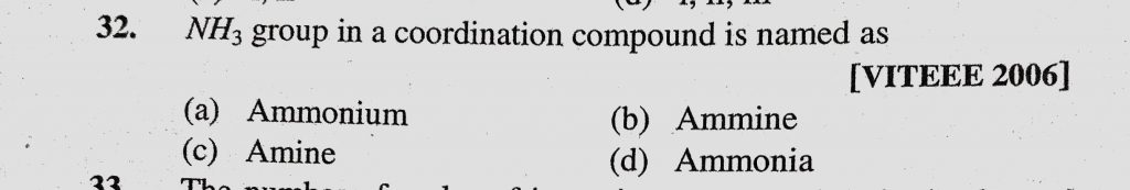 NH3 group in a coordination compound is named as (a) Ammonium (b) Ammine (c) Amine NH3 group in a coordination compound is named as (a) Ammonium (b) Ammine (c) Amine December 3, 2020 Category: Uncategorised (JEE Advanced Physics by BM Sharma + GMP Solutions) , Facebook Messenger WhatsApp Share this:TwitterFacebook Related