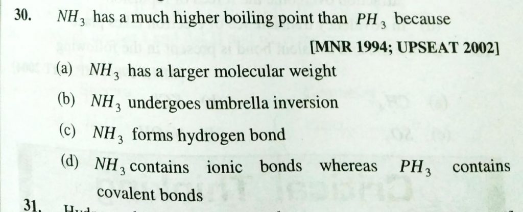 NH3 has a much higher boiling point than PH3 because (a) NH3 has a larger molecular weight (b) NH3 undergoes umbrella inversion (c) NH3 forms hydrogen bond (d) NH3 contain ionic bonds whereas PH3 contains covalent bonds In which of the following compounds intramolecular hydrogen bond is present December 9, 2020 Category: Uncategorised (JEE Advanced Physics by BM Sharma + GMP Solutions) , Facebook Messenger WhatsApp Share this:TwitterFacebook Related