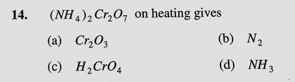 (NH4)2Cr2O7 on heating gives (a) Cr2O3 (b) N2 (c) H2CrO4 (d) NH3 (NH4)2Cr2O7 on heating gives (a) Cr2O3 (b) N2 (c) H2CrO4 (d) NH3 December 3, 2020 Category: Uncategorised (JEE Advanced Physics by BM Sharma + GMP Solutions) , Facebook Messenger WhatsApp Share this:TwitterFacebook Related